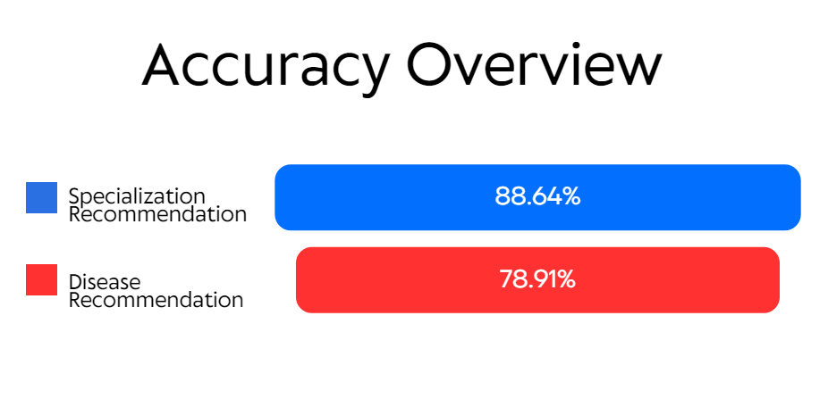 While slightly lower than the specialization accuracy, this still represents a significant achievement in accurately diagnosing diseases based on the input data. This capability is crucial, as it assists in the early and accurate detection of potential health issues, allowing for timely intervention. It underscores the system's utility in parsing complex medical data to output diagnoses that align closely with the assessments a trained physician might make, thus supporting healthcare providers in delivering high-quality care.